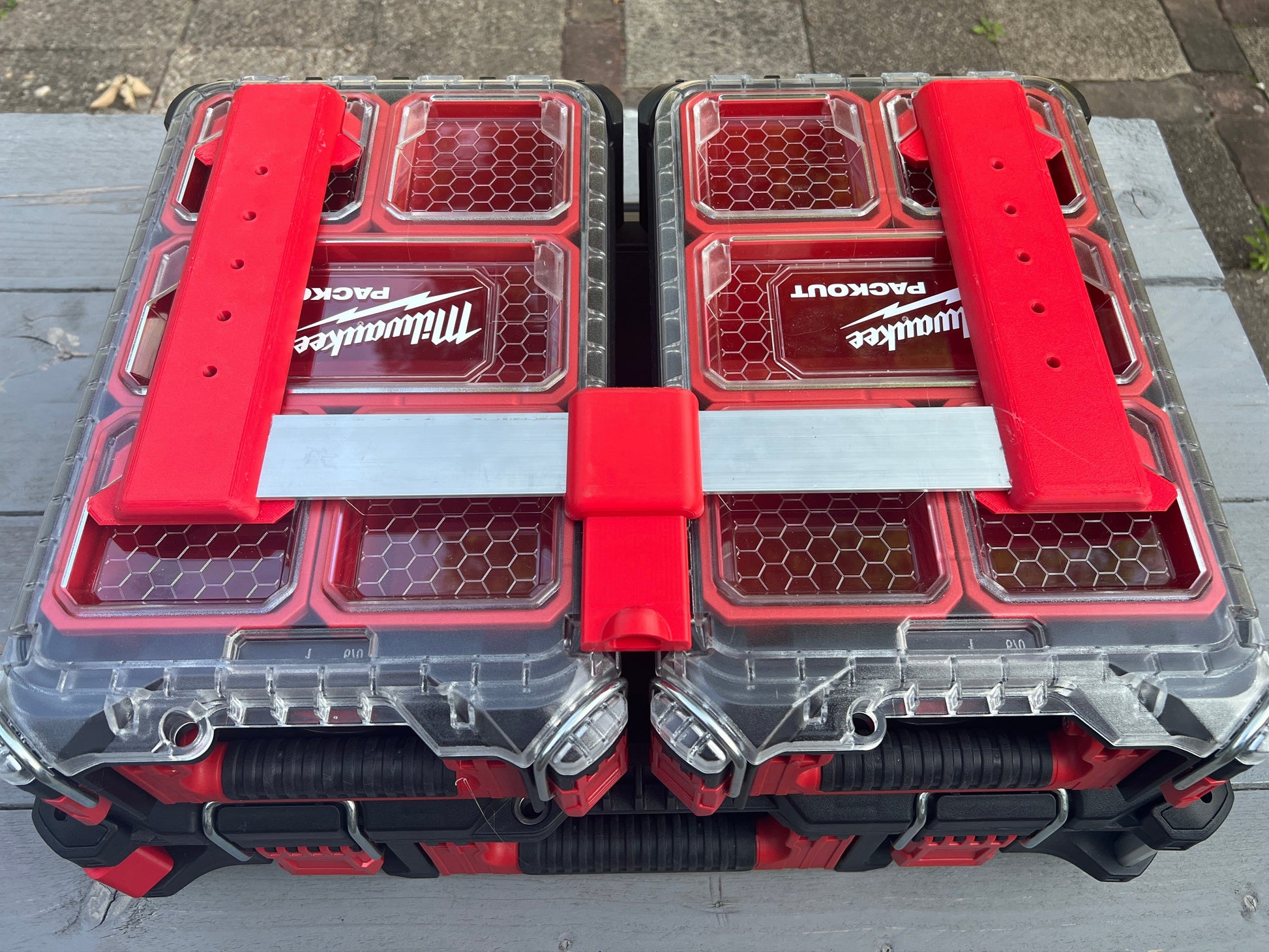 Met deze beugel kun je eenvoudig kisten, gereedschappen of een werkblad aan het deksel van een Milwaukee PackOut kist of trolley vast te zetten.