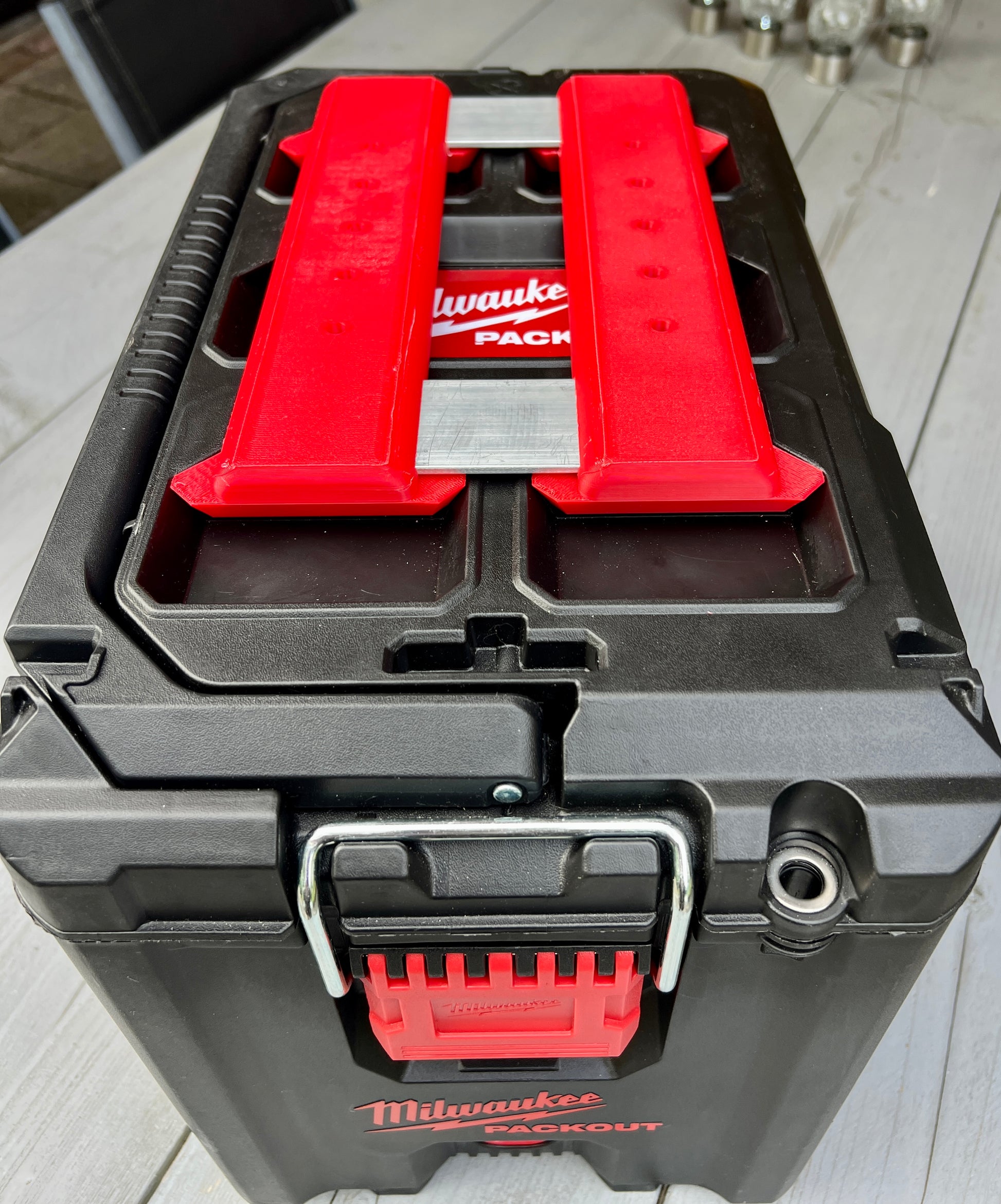 Met deze beugel kun je eenvoudig kisten, gereedschappen of een werkblad aan het deksel van een Milwaukee PackOut Compact kist of trolley vast zetten.