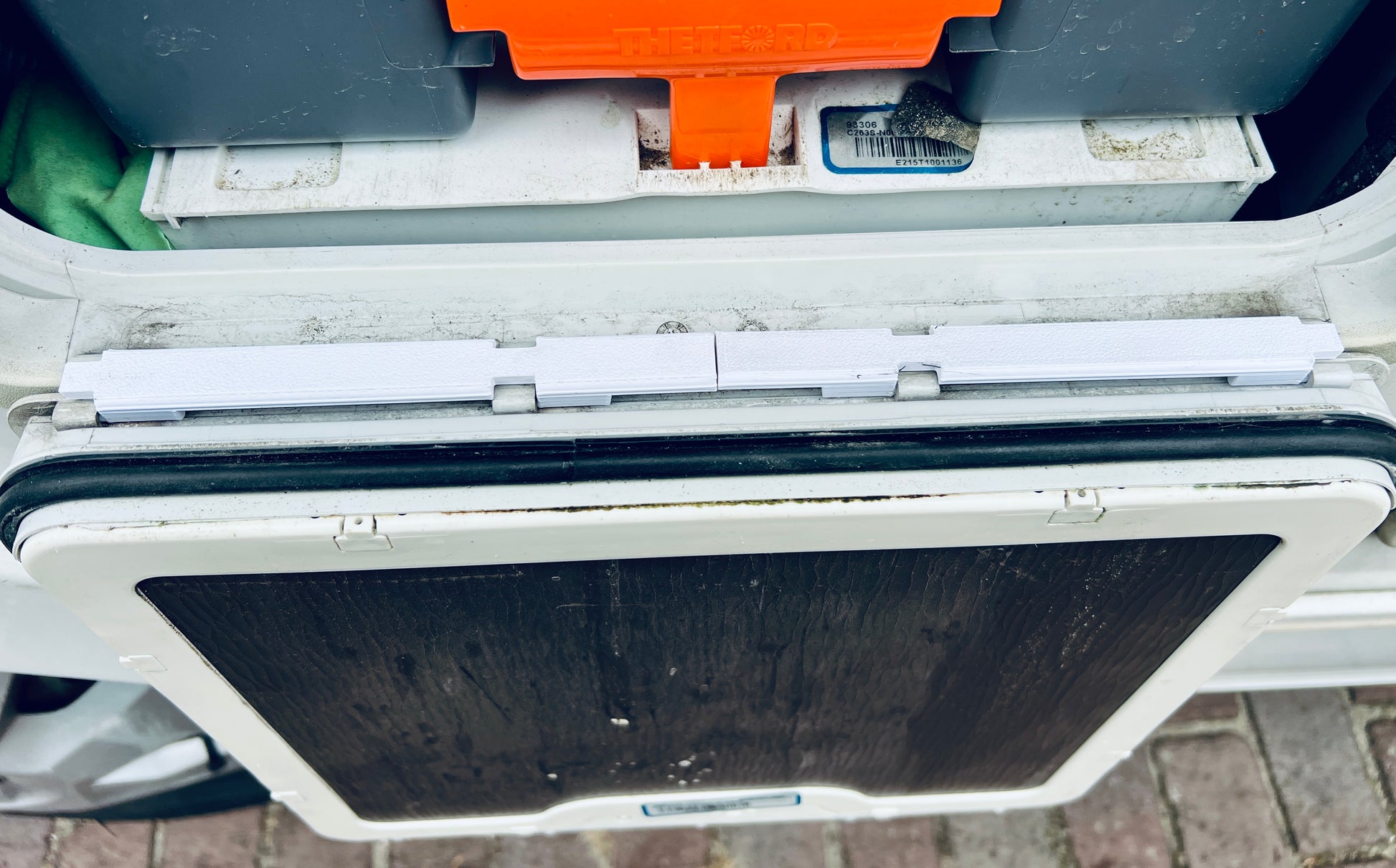Vervangingsscharnieren voor het service luik van de Thetford chemisch toilet cassette, artikelnummer 26430.